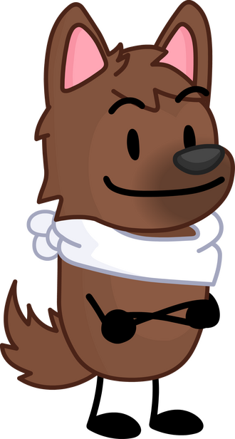 The dog himself, Whitey. Brown fur, pink paws, and his trademark white bandana.